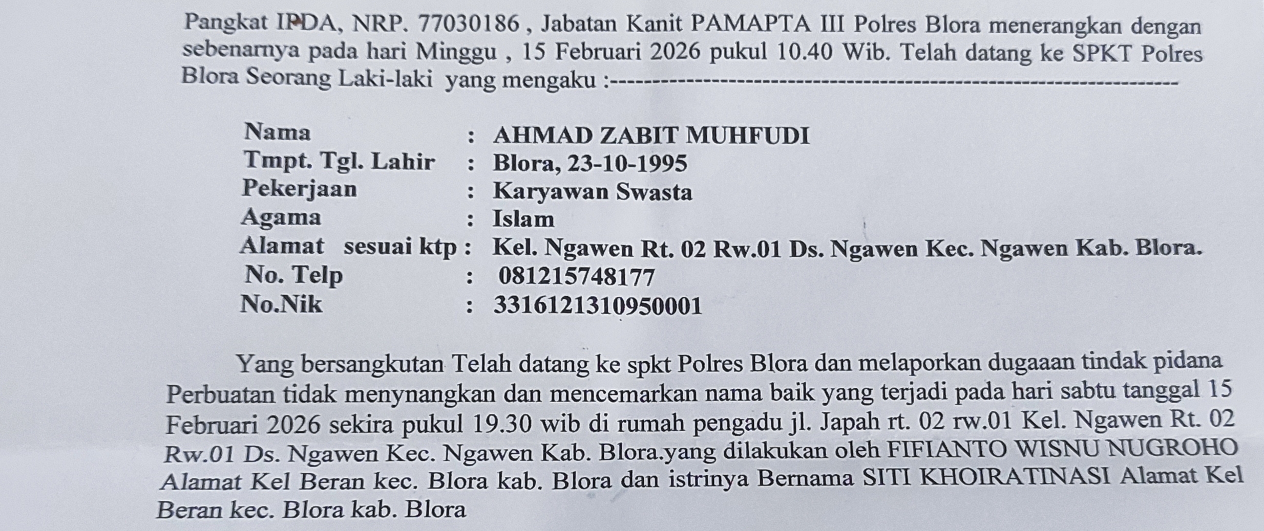 Pada Minggu, 15 Februari 2026, pelapor atas nama Ahmad Zabit Muhfudi, warga Kecamatan Ngawen, menyambangi Markas Polres Blora untuk menuntut keadilan. Laporan ini dilayangkan sebagai buntut dari insiden yang terjadi pada Sabtu, 14 Februari 2026.